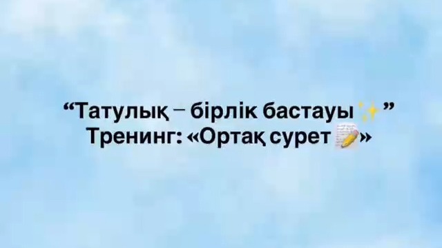 Татулық пен достыққа негізделген негізгі тапсырмада оқушылар парталас досымен бірігіп, ортақ сурет салды. Бірлескен жұмыс арқылы олар ынтымақтың, түсіністіктің және өзара сыйластықтың маңызын сезінді. Тренинг соңында әр жұп өздерінің ортақ суреті арқылы бірлік, татулық, достық, сыйластық сияқты құндылықтарды қалай түсінетінін салған суреттері арқылы баяндады.