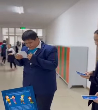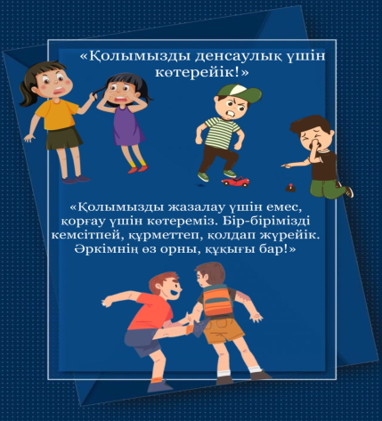 2025 жылдың 13 ақпан күні 6-8-сыныптар  арасында «Қолымызды жазалау үшін емес, қорғау үшін көтереміз!»  тақырыбында жадынама таратылды. Бұл тек денсаулығымызды қорғау ғана емес, бір-бірімізді құрметтеу мен қолдау көрсету жолы. Әсіресе, буллинг пен қинауды тоқтату үшін әрқайсымыз жауапты болуымыз керек. Күш көрсетудің орнына, қолдау мен түсіністік көрсету маңызды! Әр қолдың көтерілісі — бейбітшілік, әділеттілік және құрмет белгісі. Біз бір-бірімізді қорғап, жағымды орта қалыптастырайық!