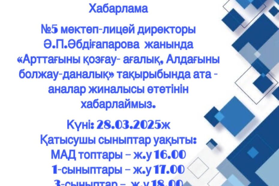 Хабарлама №5 мектеп-лицей директоры Ә.П.Әбдіғапарова жанында «Арттағыны қозғау- ағалық, Алдағыны…Наурыз 27, 2025