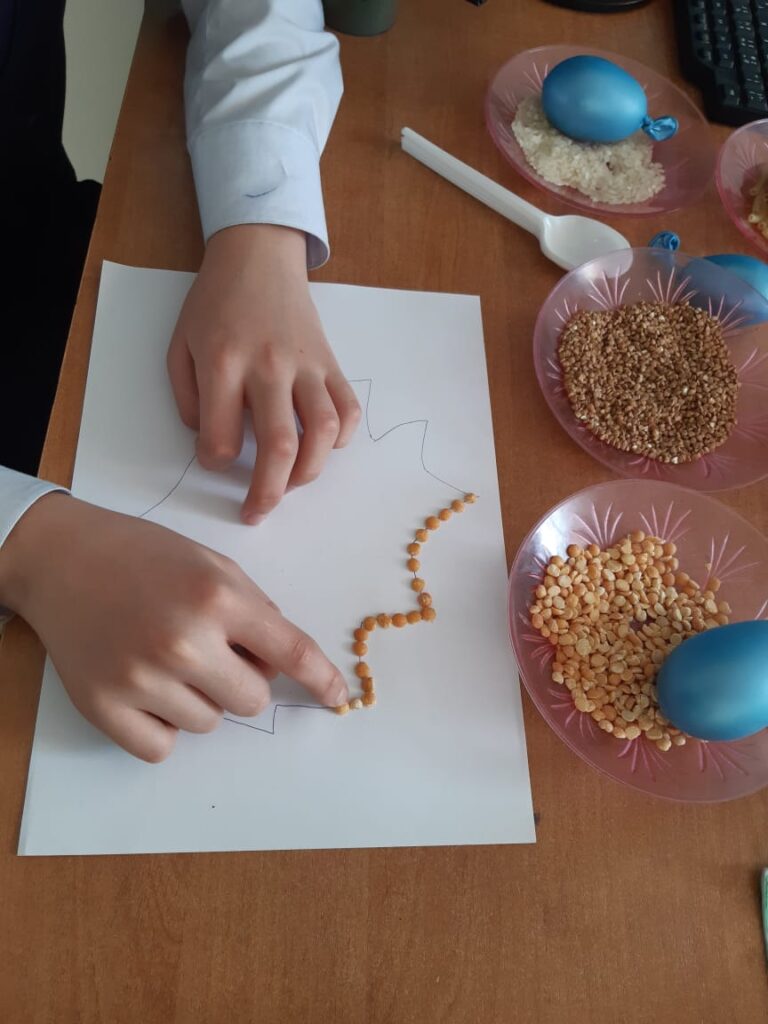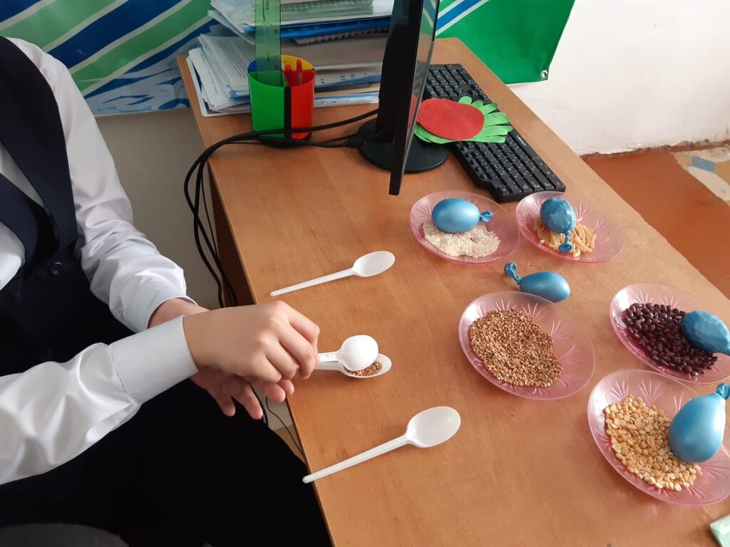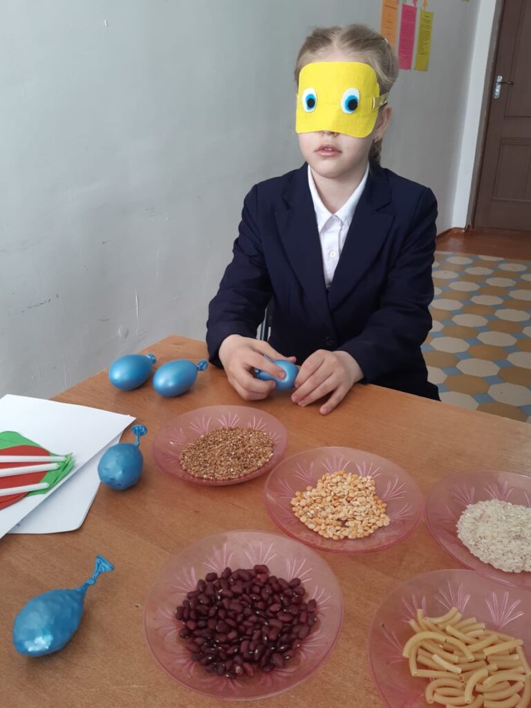 Жаңа сабақты меңгерту,   дәнді   дақылдардың сипаты, топтастырылуы  туралы  түсінік беру. Өтілген сабақты өмірмен байланыстыра отырып,  жан-жақты мәліметтер қамту. Оқушыларды өз беттерінше  шығармашылыққа,ізденімпаздыққа  тәрбиелеу мақсатында тапсырмалар орындату.Дәнді дақылдармен жұмыс балалардың сабаққа деген қызығушылығын ояты, таным қабілеттерін дамыту мақсатында сабақтар өткізілді. Балалар көздері жұмулы күйде сенсорлы шарлармен ойын, дәнді дақылдарды түрлеріне қарай жинақтаумен, қасықтың көмегімен екі қолмен бір уақытта дақылдарды әр ыдысқа бөліп салу тапсырмалары орындалды.