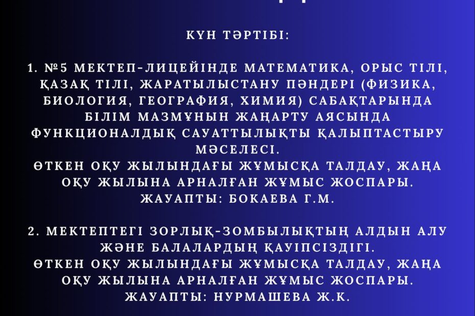 1. №5 мектеп-лицейінде математика, орыс тілі, қазақ тілі, жаратылыстану пәндері (физика, биология, география, химия) сабақтарында білім мазмұнын жаңарту аясында функционалдық сауаттылықты қалыптастыру мәселесі.
