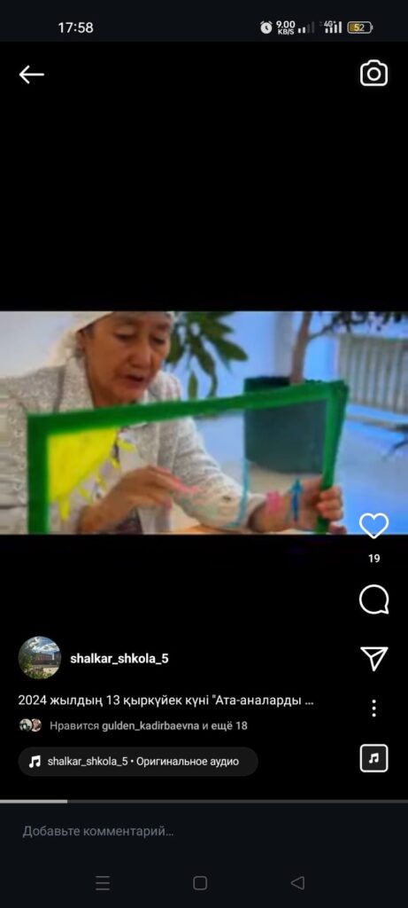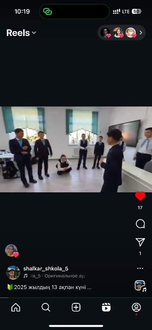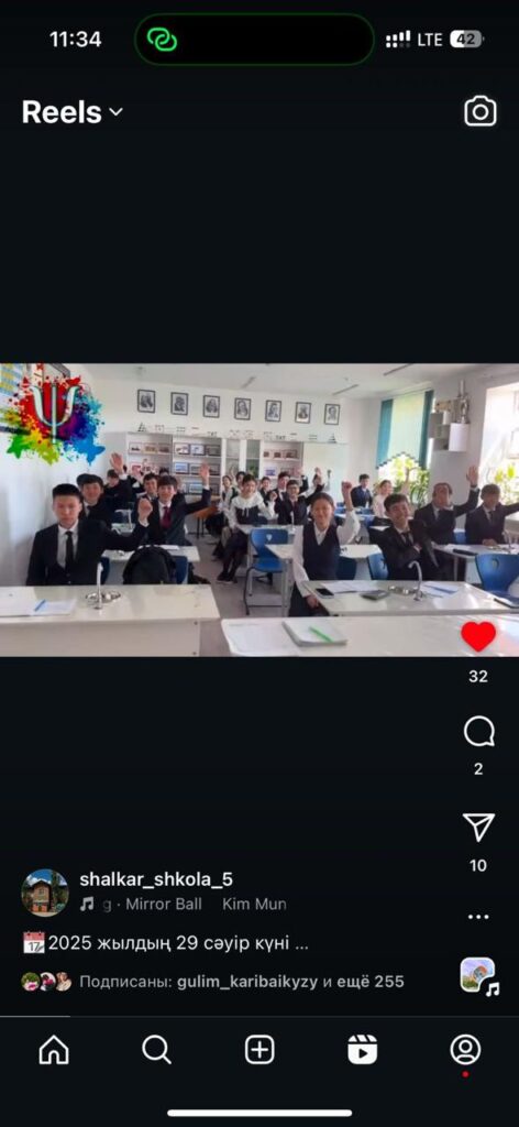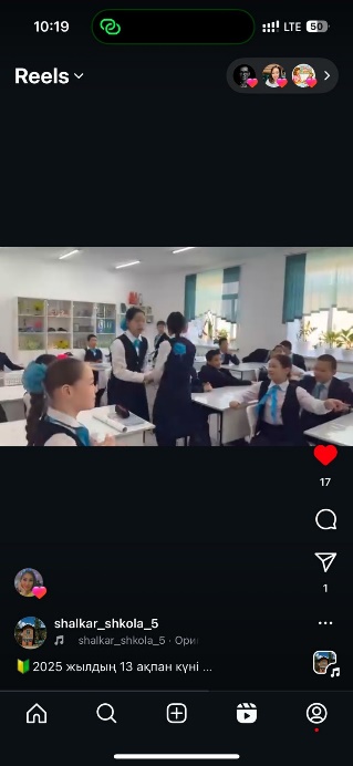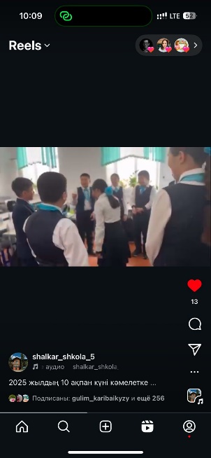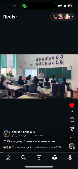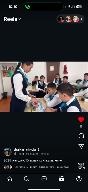 2025 жылдың 12 мамыр күні «Анаға мың алғыс» челленджіне қатысушы — 10”б” сынып оқушысы Сәрсенбі Галиаскар. Мақсаты: Оқушылардың ата-анасына деген құрметін арттыру, отбасы құндылықтарын дәріптеу, ананың орны мен рөлін ұлықтау арқылы жас ұрпақтың рухани-адамгершілік тәрбиесін қалыптастыру. Жауапты:Ата-аналар қолдау орталығының жетекшісі-Избасарова М.Ж
