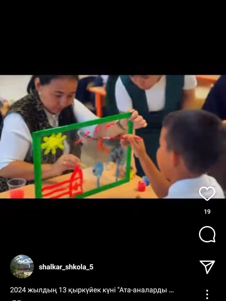 2024 жылдың 13 қыркүйек күні «Ата—аналарды педагогикалық қолдау көрсету орталығы» бағдарламасын жүзеге асыруда 4-сынып ата-аналары мен оқушыларының қатысуымен «ОТБАСЫЛЫҚ КЕЛІСІМНІҢ КЕПІЛІ – СЕНІМДІ ҚАРЫМ-ҚАТЫНАС» тақырыбында ата-ана мен бала бірлескен арт-терапиялық жұптық жұмыс өтті. Арт-терапия дегеніміз – сезімдерді сурет арқылы жеткізу. Ол жасырынған қабілетті шығаруға, қоғаммен байланыс орнатуға мүмкіндік береді. Өзін-өзі бағалауды үйретеді. Эмоцияны реттейді. Сенімсіздіктің теріс салдарынан арылу.